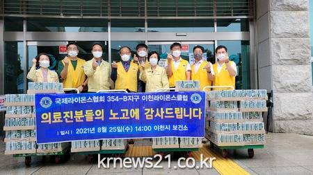 이천라이온스클럽회장(박용기) 및 함께 참석한 자원봉사센터장(민호기)은 “코로나19 방역 및 예방접종으로 노고가 많은 보건소 의료진들에게 힘을 실어주고 싶었다”며 “덥고 습한 날씨에도 코로나19 방역사업에 최선을 다하는 의료진들에게 조금이나마 도움이 되었으면 좋겠다”고 전했다.