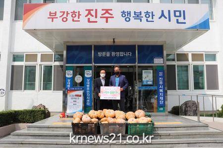 ▲ [사진제공 = 진주시]진주시 내동면 최연도 주민자치위원장은 31일 오후 2시 저소득 이웃에 전달해달라며 맷돌 호박 70덩이를 진주시복지재단(이사장 이성갑)에 전달했다.