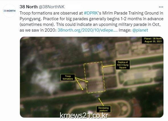 ▲ [이미지출처 = 38노스 트위터 캡처]북한이 평양에서 대규모 열병식을 준비하는 정황이 위성사진으로 포착됐다고 미국의 북한 전문매체 38노스가 1일(현지시간) 전했다.