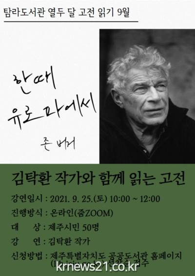 ▲ [사진=홍보포스터]제주시 탐라도서관에서는 오는 9월 25일 오전 10시, ‘김탁환 작가와 함께 읽는 고전『한때 유로파에서』’온라인 강연을 운영한다고 밝혔다.