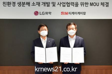 LG화학은 10일 여의도 LG트윈타워에서 삼라마이다스(SM)그룹의 자회사인 티케이케미칼과 ‘친환경 생분해 소재(PBAT) 개발 및 사업협력을 위한 MOU’를 체결했다고 12일 밝혔다.