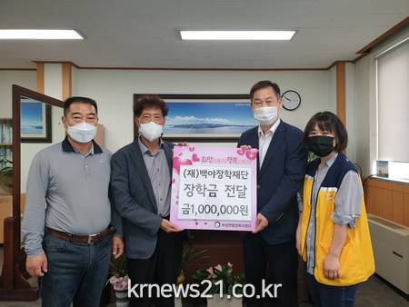 ▲ [사진제공 = 김포시](재)백야장학재단(이사장 김병희)은 지난 17일 하성면의 지역 인재 육성을 위해 학업성적이 우수하고 효행심이 두터운 모범학생에게 전달해 달라며 장학금 100만원 전달하였다.