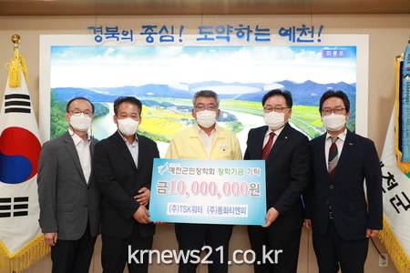 예천군민장학회(이사장 김학동)는 15일 오후 5시 ㈜티에스케이워터(대표 이몬드)와 ㈜동화티엔피(대표 정재식)로부터 장학기금 1천만 원을 기탁 받았다.