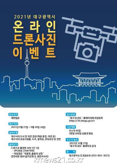 ▲ [사진=홍보포스터]대구시는 지역민들은 물론 추석 연휴를 맞아 대구를 방문하는 귀성객과 여행객 등 누구나 참여 가능한 ‘온라인 드론사진 이벤트’를 개최한다.