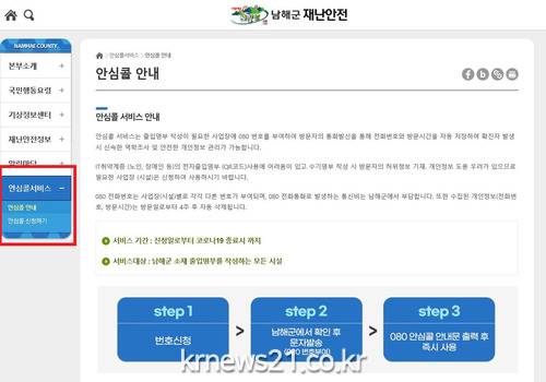 ▲ [이미지제공 = 남해군]남해군은 코로나19 선제적 방역 대응을 위해 남해군청 홈페이지에서 안심콜 서비스를 신청할 수 있는 서비스를 마련했다고 밝혔다.
