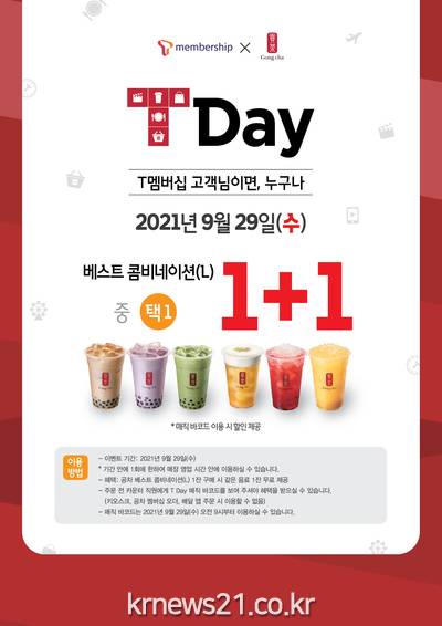 또한 ‘공차 T Day’ 프로모션 외에도 T멤버십 상시 할인 혜택(VIP/Gold/Silver 10% 할인)도 제공된다. 중복 적용은 불가능하고 결제 1회당 1번의 할인 혜택만 이용 가능하다.