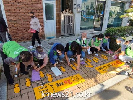 ▲ [사진제공 = 남해군]남해군자원봉사센터는 27일 창선면지역사회보장협의체(위원장 김종완) 봉사자 6명, 창선초등학교 학생 24명 및 교사와 함께 창선초등학교 인근에서 노란발자국 설치 봉사활동을 펼쳤다.
