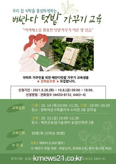▲ [사진=홍보포스터]예천군(군수 김학동) 농업기술센터는 관내 공동주택 주민들을 대상으로 베란다 텃밭 가꾸기 1일 체험 교육을 진행한다.