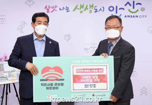 ▲ [사진제공 = 안산시]안산시(시장 윤화섭)는 29일 ㈜에이스전기(대표 장운도)로부터 사랑의 후원금 500만원을 기탁 받았다.