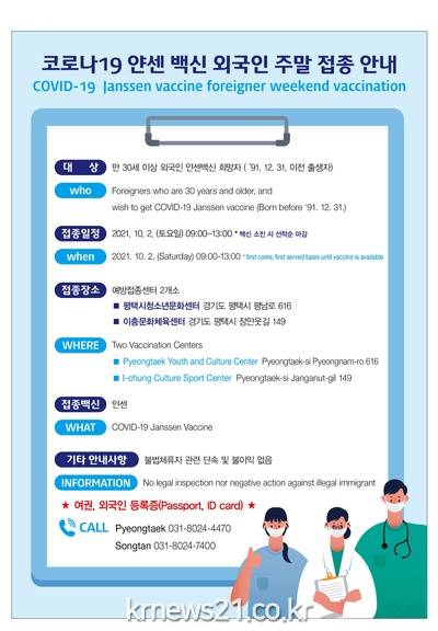 코로나19 주말접종은 만30세 이상 외국인 중 얀센백신 희망자(‘91.12.31.이전 출생자)를 대상으로 평택시청소년문화센터와 이충문화체육센터 내 예방접종센터 2개소에서 실시된다.