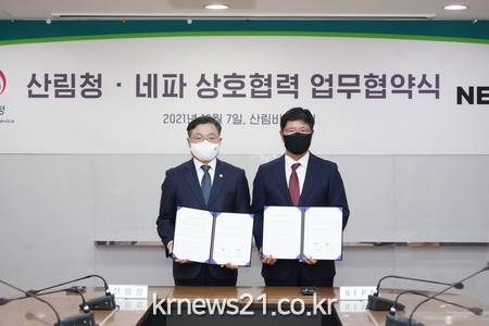 산림청(청장 최병암)과 네파(주)는 세계산림총회 홍보협업 및 탄소중립 비전 실현 등 협력을 위해 10월 7일 오후 산림비전센터에서 업무협약을 체결하였다.