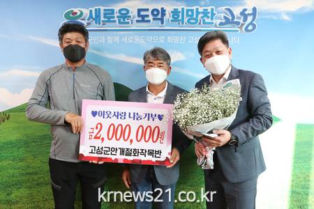 ▲ [사진제공 = 고성군]고성군안개절화작목반(회장 제강호)은 10월 7일 고성군청을 방문하여 관내 어려운 이웃을 위해 성금 200만 원을 전달했다.