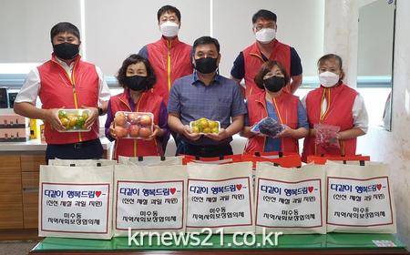 ▲ [사진제공 = 통영시]10월 7일(목) 미수동지역사회보장협의체(민간위원장 조복연, 공공위원장 김경중)는 고독사 등 고위험군을 대상으로 복지대상자의 안부를 확인하고 면역력 증진을 위해 신선한 제철과일 꾸러미를 지원하는‘다같이 행복드림 사업’을 전개하였다.