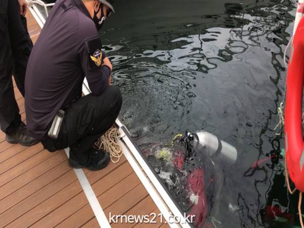 계류 중인 B호 선저 이물질(따개비) 제거 작업 중 잠수장비가 헐거워 재 결착을 위해 공기통과