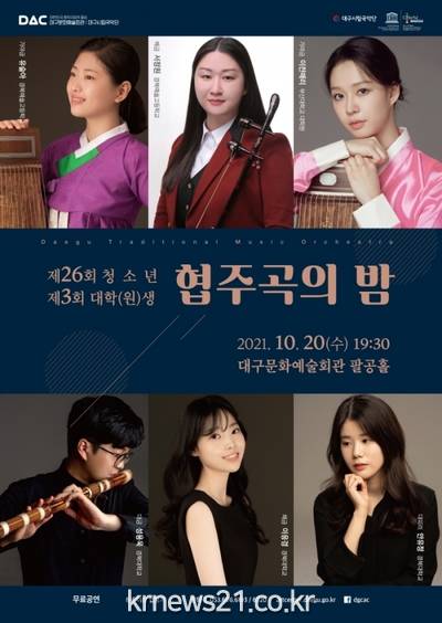 ▲ [사진=홍보포스터]대구시립국악단(예술감독 겸 상임지휘자 이현창)은 제26회 청소년 협주곡의 밤 및 제3회 대학(원)생 협주곡의 밤을 오는 10월 20일(수) 대구문화예술회관 팔공홀에서 개최한다. 고등학생에서부터 대학원생까지 국악 유망주들의 연주를 폭넓게 감상할 수 있는 공연이다.