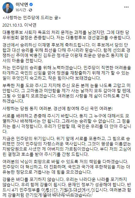 ▲ [이미지출처 = 이낙연 전 대표 페이스북]대선 경선 결과에 이의를 제기했던 더불어민주단 이낙연 전 대표가 당 당무위원회 결정을 받아들인다며 경선 결과도 수용하기로 했다.