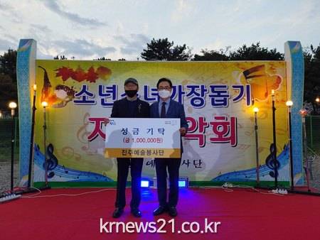 ▲ [사진제공 = 진주시]진주시복지재단(이사장 이성갑)은 지난 24일 진주예술봉사단(단장 최점섭)에서 성금 100만원을 기탁했다고 밝혔다.