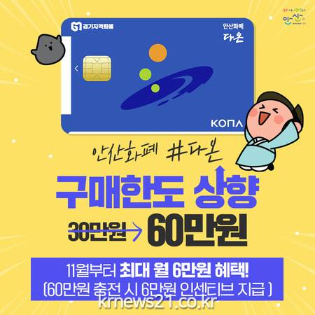 ▲ [사진=홍보포스터]안산시(시장 윤화섭)는 ‘2021 코리아세일페스타(11.1~15)’와 연계해 지역경제 활성화를 위해 올 11~12월 두 달 동안 안산화폐 ‘다온’ 충전 한도액을 기존 월 30만 원에서 60만 원으로 확대한다고 29일 밝혔다.