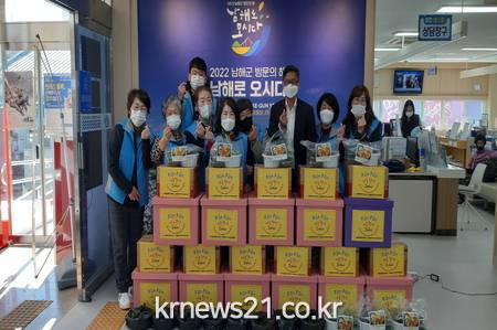 ▲ [사진제공 = 남해군]남해읍 지역사회보장협의체(공동위원장 김원근, 김민자)는 지난 28일(목) 남해읍 복지사각지대에 있는 위기가정 및 취약계층 등 복지서비스가 필요한 세대를 발굴하여, ‘펀펀 나눔향기 꾸러미’와 ‘밑반찬 6종’을 전달했다.