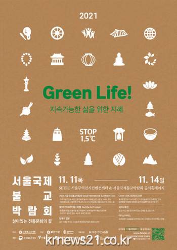 ▲ [사진=홍보포스터]위드 코로나의 시대, 지속가능한 삶의 지혜를 모색하는 특별한 박람회가 열린다. 대한불교조계종이 주최하고 불교신문사, 불광미디어가 주관하는 2021서울국제불교박람회가 11월 11일부터 14일까지 서울무역전시컨벤션센터(SETEC)와 온라인 홈페이지 및 애플리케이션에서 동시에 펼쳐진다.