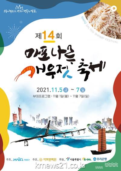 ▲ [사진=홍보포스터]서울 도심 한복판에서 마포나루의 번성했던 옛 모습을 재현하고, 마포나루에 실어 나르던 유명산지 새우젓을 할인된 가격에 살 수 있는 ‘제14회 마포나루 새우젓축제’가 11월 5일부터 7일까지 3일간, 온·오프라인으로 열린다.