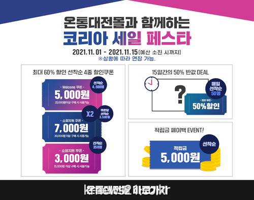 또한, 매일 특정상품을 선착순으로 구매한 50명에게 최대 1만 5천원 절반가격으로 판매하는 ‘반값 딜’행사가 진행되며, 5만 원 이상 구매고객 선착순 2,021명에게는‘적립금 페이백’ 5천 원이 지급된다.