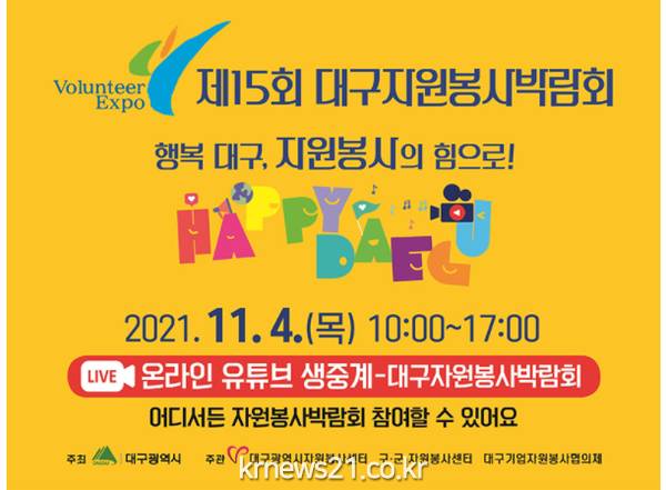▲ [사진=홍보포스터]대구시가 주최하고 대구시, 구·군자원봉사센터, 대구기업자원봉사협의체가 주관하는 ‘제15회 대구자원봉사박람회’는 ‘행복 대구! 자원봉사의 힘으로!’ 라는 슬로건으로 위드코로나 가운데 일상회복 중인 시민들을 위해 자원봉사의 감동을 온택트로 즐길 수 있도록 축제의 장으로 마련됐다.