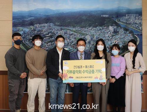 ▲ [사진제공 = 진주시]칸타빌레×에스메로(대표 박수현)는 지난 1일 진주시복지재단(이사장 이성갑)을 방문하여 기부음악회 수익 물품을 기탁했다.