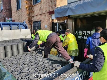 ▲ [사진제공 = 의정부시]의정부시 흥선동은 11월 7일 소중한 사람들의 모임(회장 유연형)에서 의정부시 100일 사랑릴레이 배턴 잇기 일환으로 취약계층을 대상으로 연탄 600장 나눔 봉사를 펼쳤다고 밝혔다.