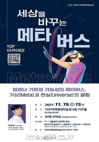 ▲ [사진=홍보포스터]영등포구(구청장 채현일)는 구민에게 사회‧인문학적 소양과 새로운 시각으로 세상을 바라볼 수 있는 기회를 제공하기 위한 YDP아카데미의 프로그램 중 하나인 ‘세상을 바꾸는 메타버스’ 특강을 오는 11월 19일 개최하고 특강에 참여할 수강생을 선착순 모집한다.