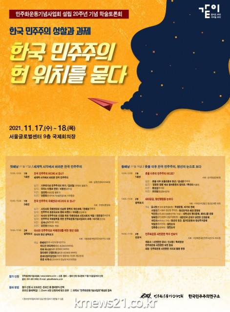 ▲ [사진=홍보포스터]민주화운동기념사업회(이사장 지선, 이하 사업회) 한국민주주의연구소는 11월 17일(수)~18일(목) 양일간 서울글로벌센터 9층 국제회의장에서 사업회 설립 20주년 기념 학술토론회를 개최한다고 15일 밝혔다.