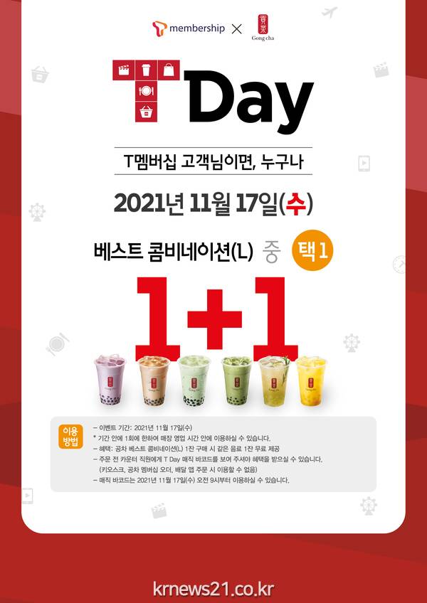 ▲ [사진=홍보포스터]글로벌 티(Tea) 음료 전문 브랜드 공차코리아가 SKT T멤버십 회원을 대상으로 11월 17일(수) 하루 동안 ‘공차 T Day’ 프로모션을 진행한다고 밝혔다.