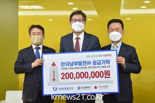 ▲ [사진제공 = 부산시]부산시(시장 박형준)는 오늘(15일) 시청에서 부산혁신도시 이전 공공기관인 한국남부발전㈜의 사회취약계층 및 코로나19 관련 의료진 지원 성금 전달식을 개최했다고 밝혔다.