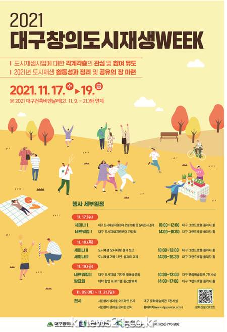 ▲ [사진=홍보포스터]대구시와 (재)대구경북연구원이 공동으로 주최하고, 대구시 창의도시재생지원센터가 주관하는 ‘2021 대구창의도시재생WEEK’가 오는 11월 17일(수)부터 19일(금)까지 대구그랜드호텔 플라자홀과 대구문화예술회관 전시실에서 개최된다.