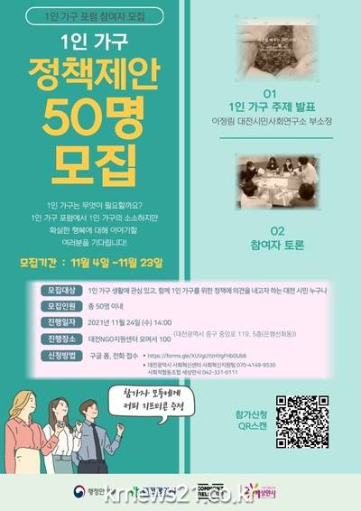 ▲ [사진=홍보포스터]대전시는 행정안전부 지역거점별 소통협력공간 조성(COMMONZ FIELD 대전) 사업의 일환으로 11월 24일 오후 2시 대전NGO지원센터에서‘1인 가구 포럼’을 개최한다고 17일 밝혔다.