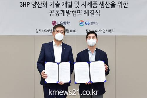 LG화학은 18일 마곡 LG사이언스파크에서 GS칼텍스 허세홍 사장, LG화학 신학철 부회장 및 주요 연구개발 인력들이 참석한 가운데 생분해성 플라스틱 원료인 3HP (Hydroxypropionic acid, 하이드록시프로피온산) 양산 기술 개발 및 시제품 생산을 위한 공동 개발협약(JDA)을 체결했다.