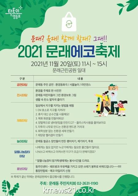 ▲ [사진=홍보포스터]영등포구(구청장 채현일)는 오는 11월 20일 온 가족이 함께 즐길 수 있는 친환경 마을축제 ‘2021 문래에코축제’를 개최한다고 밝혔다.