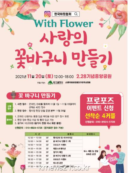 ▲ [사진=홍보포스터]대구시는 꽃과 함께하는 힐링 시간을 제공하고, 화훼 소비 활성화를 위한 ‘사랑의 꽃바구니 만들기’ 행사를 11월 20일(토) 2.28기념중앙공원에서 개최한다.