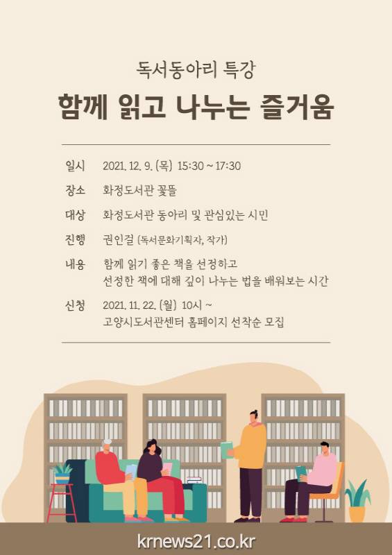▲ 사진=고양시고양시(시장 이재준) 화정도서관이 시작하는 독서동아리를 위한 특강 「함께 읽고 나누는 즐거움」을 오는 12월 9일(목) 운영한다.