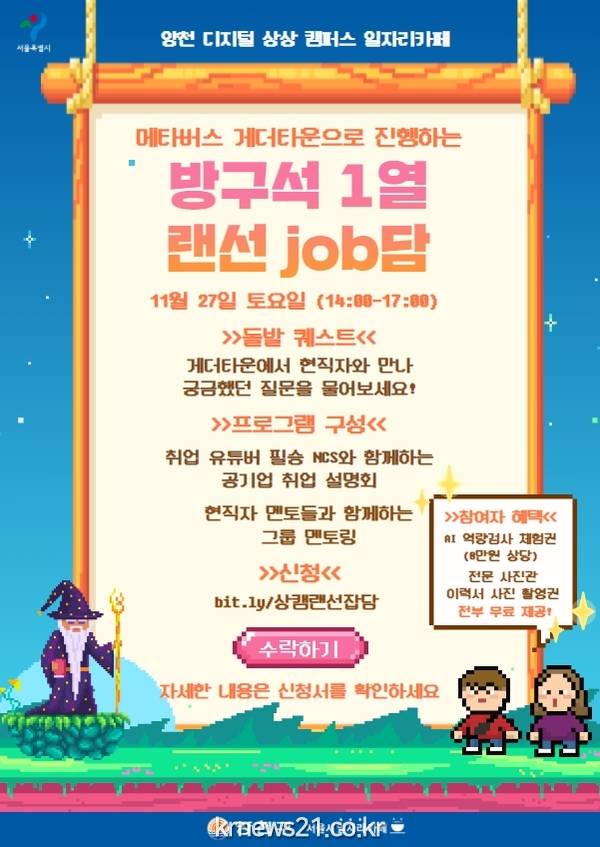 ▲ 사진=양천구양천구(구청장 김수영)가 오는 11월 27일 청년 구직자를 대상으로 메타버스 플랫폼(게더타운)을 활용한 취업콘서트 '방구석 1열 랜선 job담'을 진행한다고 밝혔다.