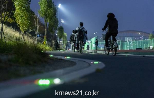 ▲ 사진=구로구구로구가 안양천 자전거도로 구간 내에 태양광 LED 표지병 1400여개를 설치했다.