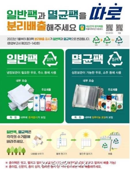환경부는 “종이팩을 배출 단계에서부터 종류별로 분리하면 파지 재활용 비용은 낮추고 재활용 품질은 높이면서 종이팩 자체 재활용률도 향상시킬 수 있을 것으로 기대된다”며 “종이팩이 고품질 원료로 재활용될 수 있도록 씻고, 펼치고, 말려서 배출해주시기 바란다”고 당부했다.