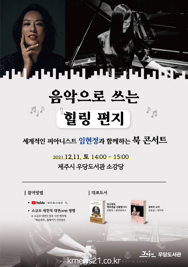 ▲ 사진=제주시 / 음악으로 쓰는 힐링편지 포스터제주시 우당도서관(관장 김철용)에서는 오는 12월 11일(토요일) 14시에 세계적인 피아니스트이자 작가인 임현정과 함께하는 북콘서트「음악으로 쓰는 힐링 편지」를 운영한다고 밝혔다.