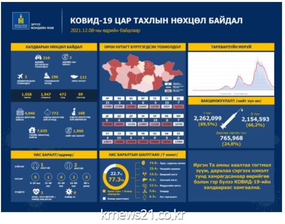 보건부는 2021년 12월 8일 코로나바이러스 감염 데이터를 발표했다. 지난 24시간 동안 310명의 새로운 사례가 확인되었다. 이 중 196개는 울란바토르에, 111개는 농촌 지역에 등록되었다.