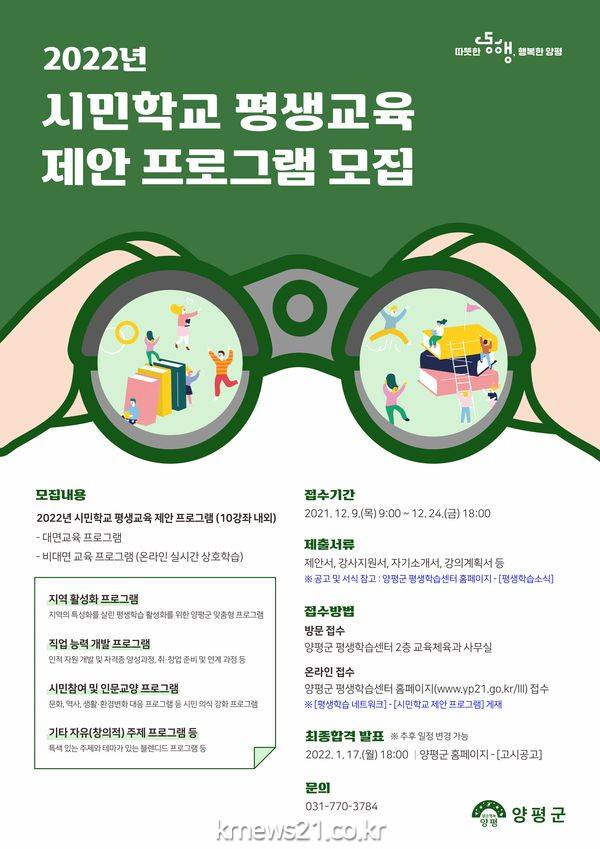 ▲ 사진=양평군양평군(군수 정동균)은 오는 24일까지 ‘2022년 시민학교 평생교육 제안 프로그램’을 공개 모집한다고 밝혔다.
