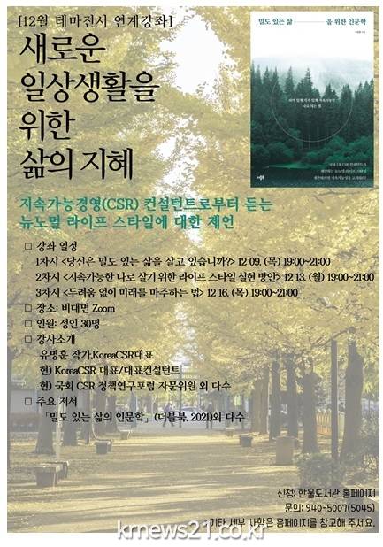 ▲ 사진=파주시파주시 한울도서관은 9일부터 16일까지 3회에 걸쳐 비대면으로 시선+ 테마전시의 연계 강좌를 개최한다. 강의는 <밀도 있는 삶을 위한 인문학>의 저자이자 국내 1호 지속가능경영(CSR) 컨설턴트인 유명훈 작가가 진행한다.