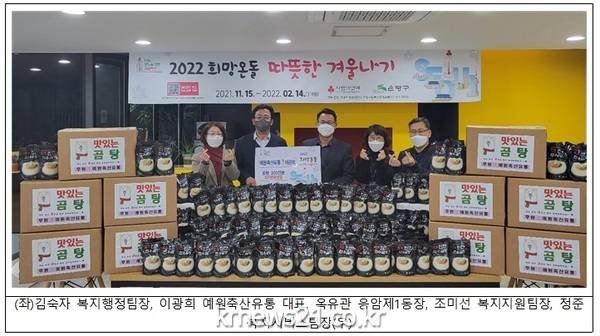 옥유관 응암1동장은 “올해는 코로나19로 인해 자영업자들도 힘든 상황에서 이웃돕기에 선뜻 동참해주신 예원축산유통에 진심으로 감사드린다”라며 “11월 15일부터 2022년 희망온돌 따뜻한 겨울나기 모금캠페인이 진행되고 있어 보내주신 성금·품은 지역내 저소득가구에 소중하게 전달하겠다”라고 밝혔다.
