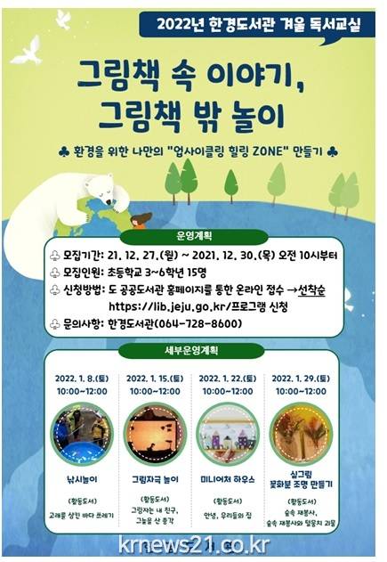 ▲ 사진=제주시한경도서관에서는 겨울방학 동안 지역 어린이들이 유익하고 알찬 시간을 보낼 수 있도록 2022년 1월 한 달간 겨울독서교실 <그림책 속 이야기, 그림책 밖 놀이>를 운영한다.