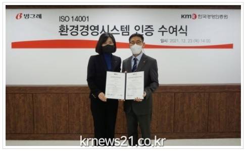 빙그레가 한국경영인증원으로부터 환경경영시스템(ISO 14001) 국제표준 인증을 획득했다.