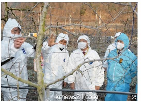 ▲ 사진=충청북도청충북농업기술원(원장 서형호)은 박병홍 농촌진흥청장이 23일 충주시 산척면에 소재한 ‘과수화상병 현장 연구 격리시설과 농가실증 포장’을 방문해 차단방역 등 내년 방제 계획에 대한 현장 점검을 진행했다고 밝혔다.